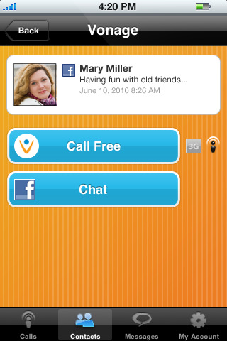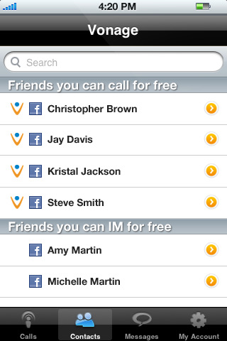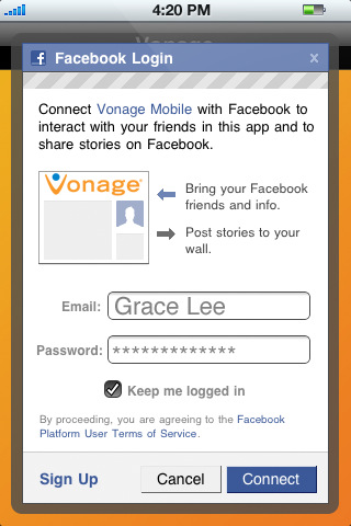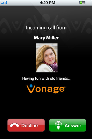 Vonage可供免費下載到智慧型手機上, 並且透過Wi-Fi或3G、4G網路使用。此外,用戶可不必在手機裡輸入電話號碼或任何資訊就可撥打電話,因為當用戶登入Facebook帳號 後,Vonage會自動列出好友中也有使用此應用程式的名單,只需點擊一下好友名單就行了,若用戶選取的好友無使用此應用程式,則會自動變成簡訊傳送給對 方,不過雖然能免費通話,但資料傳輸仍需付費。